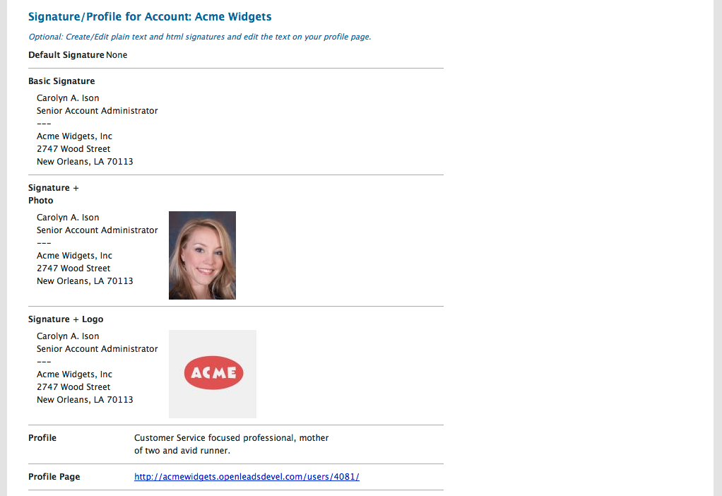 Every user account has a Personal Profile (accessed by clicking on the icon under "Settings>Personal Profile" or under "Settings" in the account header). Within the personal profile settings there is a section to create three different Signatures - a "Basic Signature," a "Signature with Photo," and a "Signature with Logo" - and the ability to chose which of these (or none) to be their default signature when creating a new email to a lead.