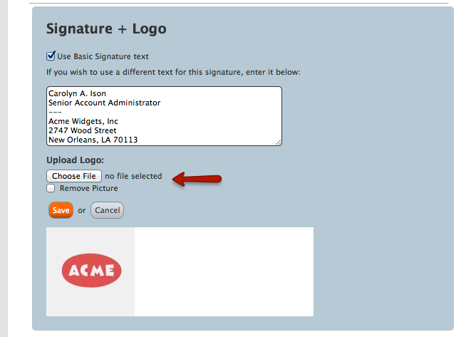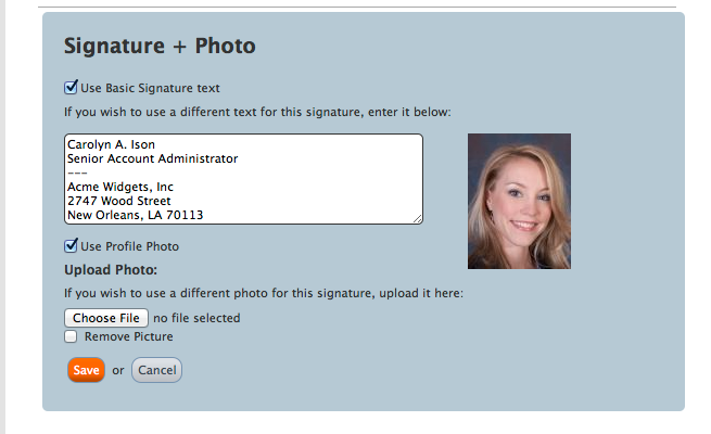 The "Photo Signature" can use your profile pic, or you can choose to upload a different one.