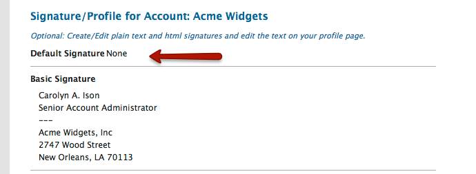 Mousing over and clicking on this line gives the user a dropdown to choose their default signature.